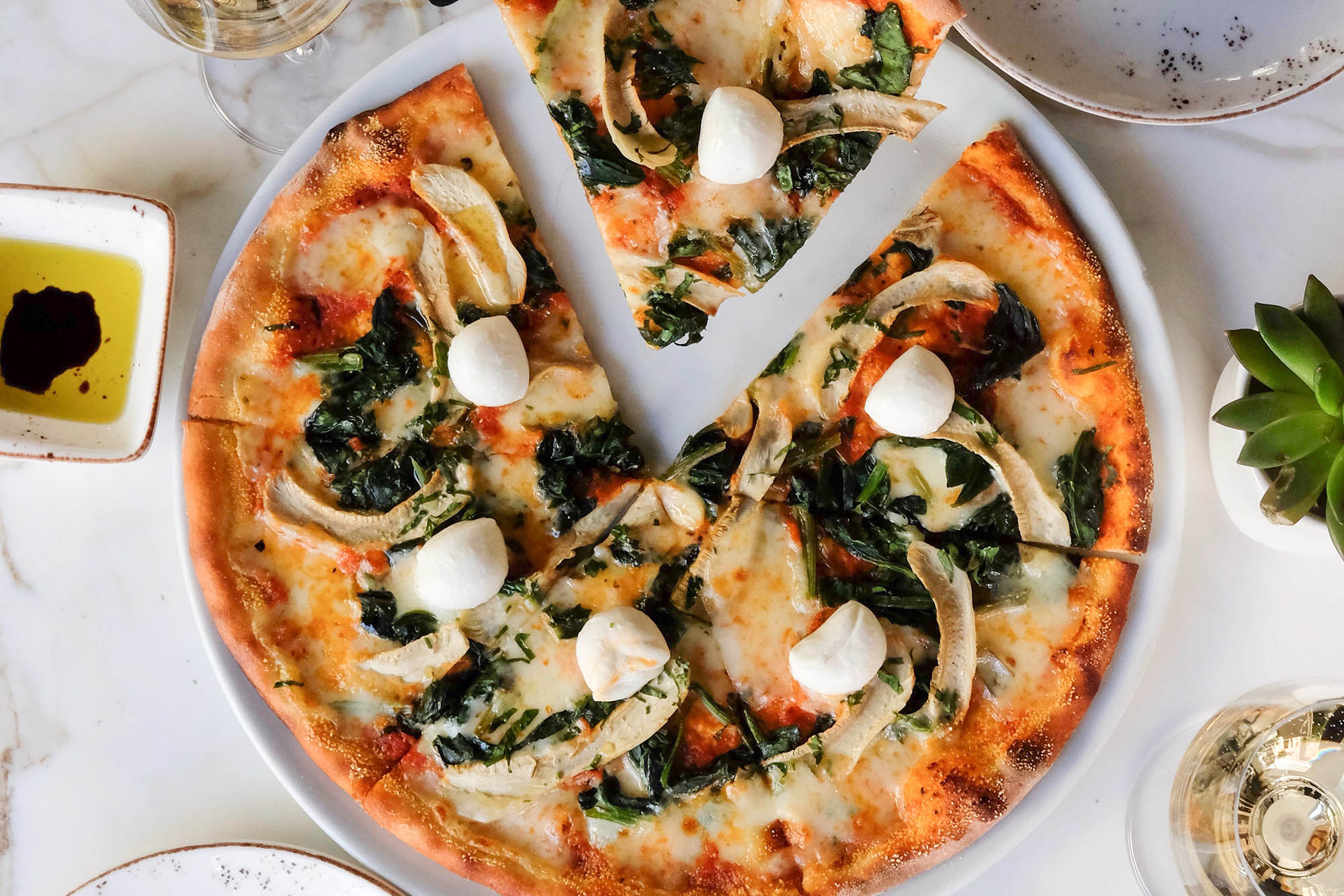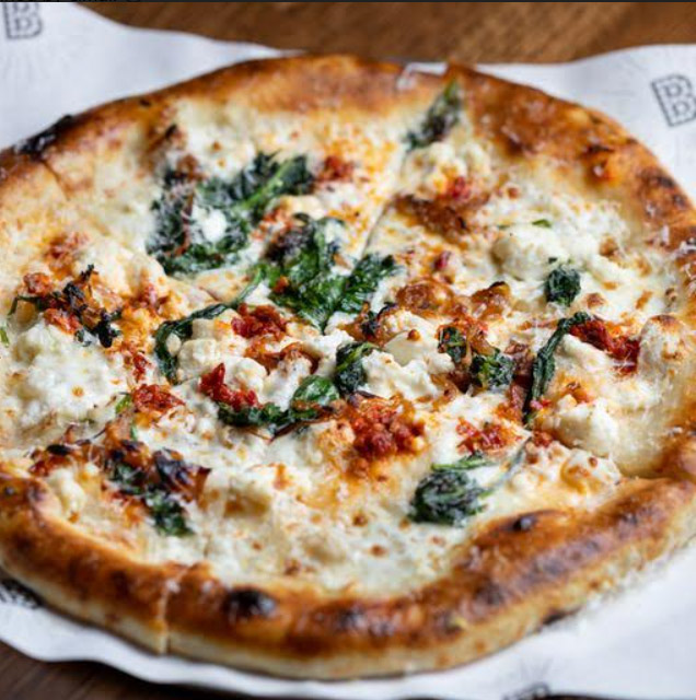 Fresh Ricotta, hand-pulled mozzarella, calabrian chilies, sauteéd spinach, cara- melized onion, lemon zest